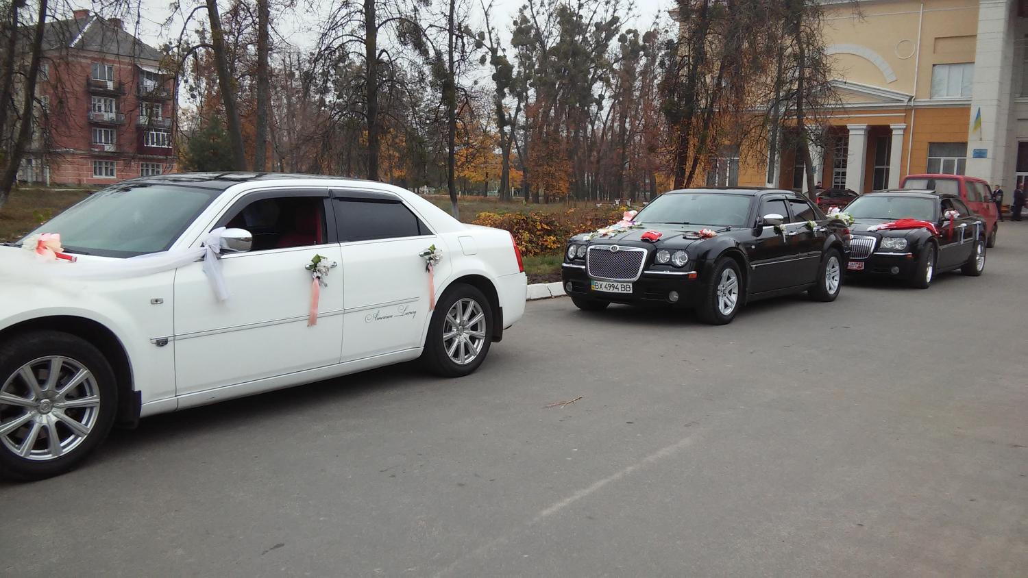 Весільний кортеж. У нас Ви можите замовити 3 чорних та 2 білих Крайслери та білий лімузин Крайслер 300с. Обслуговуємо весілля, та інші VIP поїздки