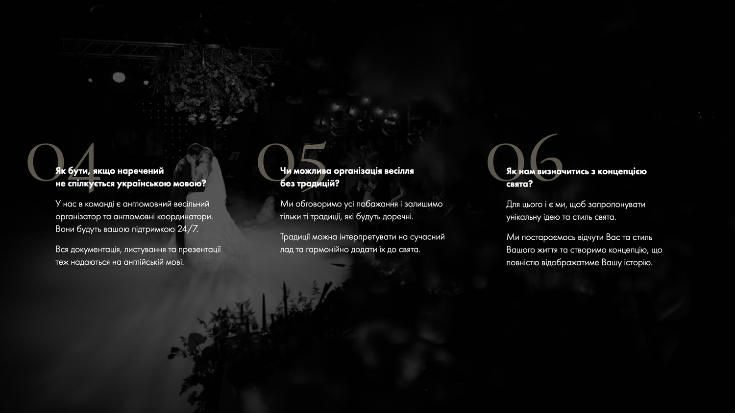 На кожному етапі підготовки ми вразимо рівнем професіоналізму та сервісу, проявляючи виняткову турботу про Вас та Ваших гостей.