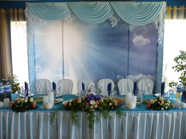 Уникальный декоративный элемент, который способен преобразить облик любого помещения, задать романтический, возвышенный тон атмосфере всего торжества.Место молодых на праздничном банкете оформлено воздушно и нежно. Молодожены действительно будут на Седьмом Небе от счастья!А ведь, «Браки заключаются на небесах»…Итак, в комплект входит:ширма ( с подсветкой), скатерть, юбка, чехлы на стулья (6шт),украшение стола (блюдо-фофор, цветы), подсвечники, декоративные украшения (по желанию).Мы не забыли и о гостевых столах. Украшения выдержаны в едином стиле.